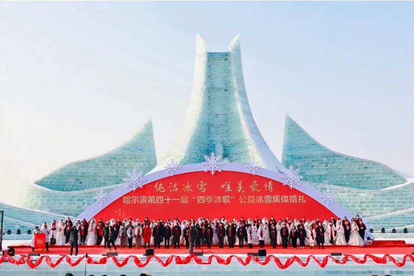 哈尔滨公益冰雪集体婚礼是中国首个以冰雪为载体的婚礼大典活动,迄今已成功举办41届,共有来自全球五大洲20多个国家的1320对新婚和纪念婚夫妇,到哈尔滨观赏冰雪奇观,体验冰雪激情,在象征忠贞的冰雪世界,开启幸福的婚姻旅程。