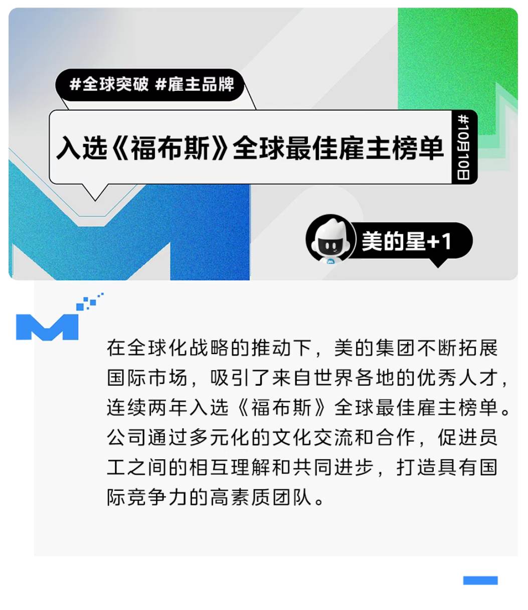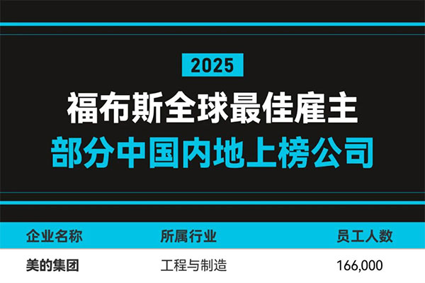 近日,全球知名商业媒体《福布斯》发布了2025年全球最佳雇主榜单,美的集团凭借卓越的企业管理、优越的员工体验和持续的创新能力,连续两年成功入选。这一殊荣不仅是对美的集团雇主品牌影响力的高度认可,更是对我们人才吸引与培养、企业文化建设等方面表现的充分肯定。