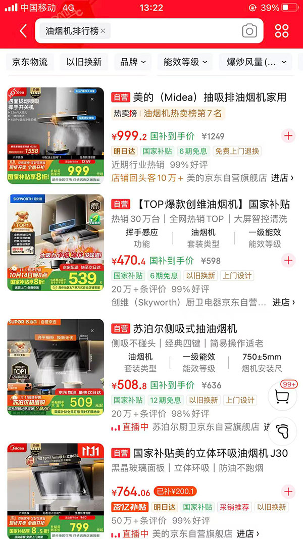 从各大平台综合信息获知,广东某一线品牌,欧式烟机风量21m³/分,补贴后价格仅为695元,同是广东的、同样是一线品牌,22m³/分的带智能清洗功能的补贴价之后不足1000元。