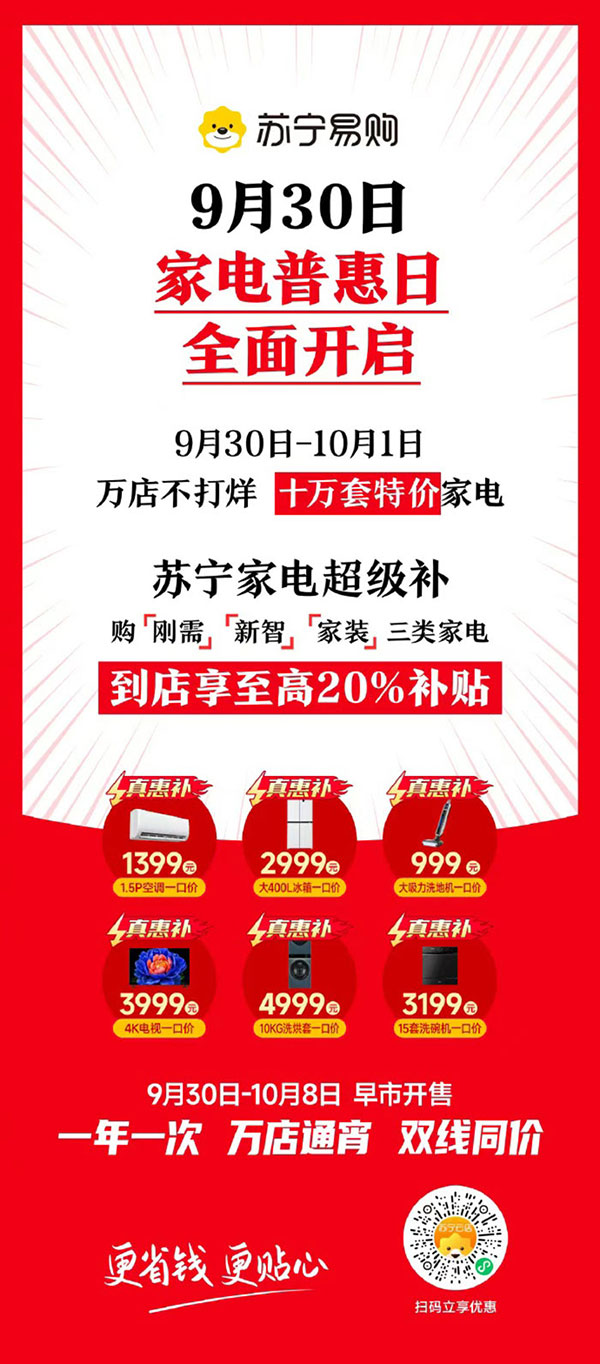 在此背景下,本届双十一对家电厂商而言,已超越常规大促,成为应对“后政策时代”挑战、消耗库存、回笼资金的关键一役。从苏宁易购的“家电普惠日”到京东的“带电新品狂欢”,再到天猫的“以旧换新四重补贴”,平台与厂商联手释放优惠,试图撬动市场需求。京东数据显示,截至10月20日,家电家居超2000个品牌增长超100%,带电新品成交额增长84%,百吋大屏电视、健康风空调等升级品类增速尤为迅猛。这种爆发式增长的背后,是行业对“后政策时代”增长动能的迫切寻找——当国补等外部推力减弱,大促成为消耗企业自身资源、考验综合实力的试金石。