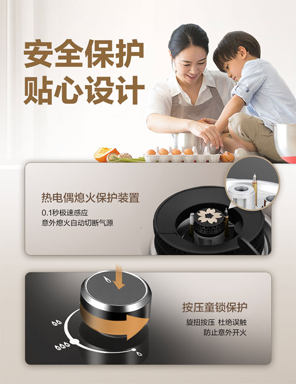 采用国家能效标准,樱花燃气灶S507GA热效率高达63%,燃烧充分且节能环保。零秒点火技术让烹饪顺畅无延迟。热电偶熄火保护装置可在0.1秒内感应异常熄火,自动切断气源;旋扭按压的童锁设计,杜绝孩童误触的开火,为厨房带来多重安全保障,让每一次烹饪都安心无忧。