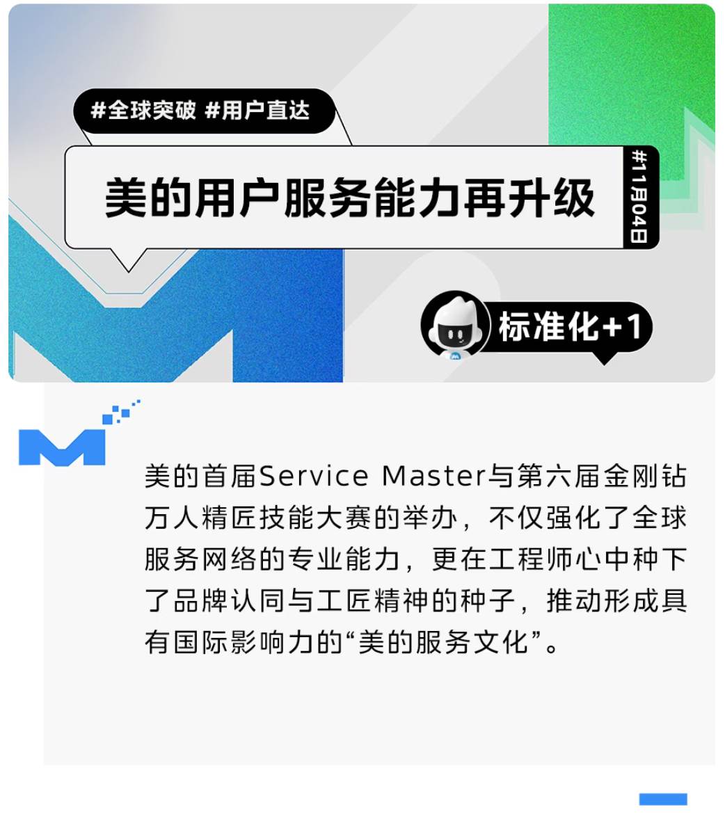 美的首届Service Master与第6届金刚钻万人精匠技能大赛的举办,正是这一战略的有力实践。它不仅强化了全球服务网络的专业能力,更在工程师心中种下了品牌认同与工匠精神的种子,推动形成具有国际影响力的“美的服务文化”。