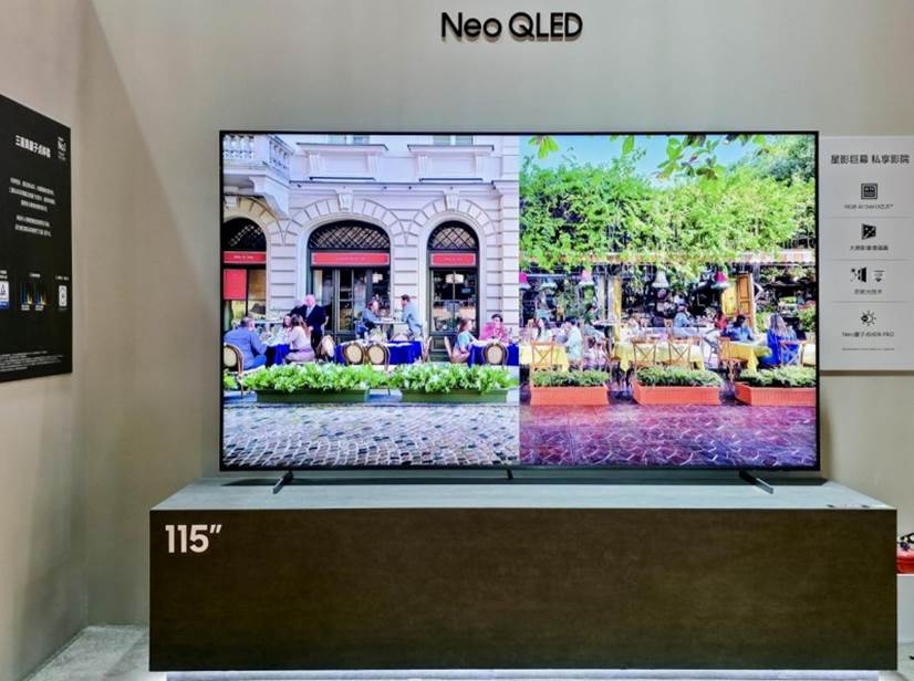 三星电视以全场景产品布局,为用户解锁家居生活的多元价值。在观影场景中,大屏化已成为当代客厅娱乐的核心趋势,三星作为超大尺寸电视领域的引领者,此次展出的115英寸Neo QLED 4K QN90F星影巨幕成为家庭影院场景的核心代表。NQ8 AI Gen3芯片成为电视的核心驱动力,而专为巨幕体验研发的超大屏影像增强器,整合了AI驱动的影像增强、降噪、清晰度增强及智能黑色增强技术,确保了巨幕上每一帧画面的精彩绝伦。4.2.2声道扬声器系统、杜比全景声与音画追踪OTS+技术完美协作,Q交响乐技术则可实现电视的扬声器和三星条形音响同步播放,营造出更具包裹感的声场。