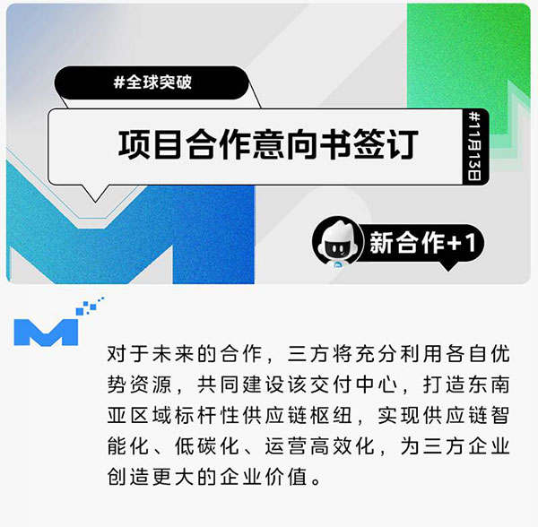 11月12日,美的国际供应链与金领东南亚(中远海控下属公司)、普顺投(普洛斯下属公司)在泰国签订了绿色智慧供应链(泰国)交付中心(以下简称“交付中心”)项目合作意向书。