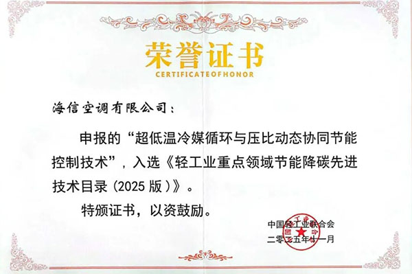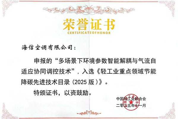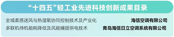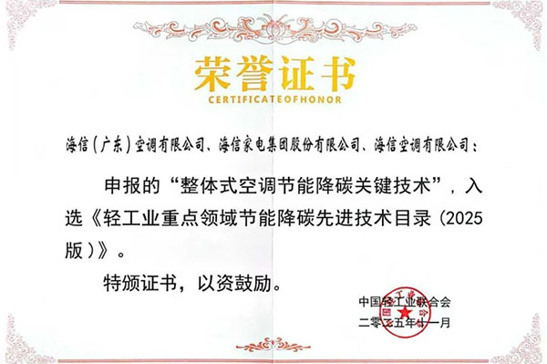 为加速推广先进适用节能降碳技术,推动重点领域节能降碳,促进轻工业绿色转型,中国轻工业联合会组织编制并形成了《轻工行业重点领域节能降碳先进技术目录(2025版)》,海信(广东)空调有限公司、海信家电集团股份有限公司、海信空调有限公司3项节能降碳成果入选。