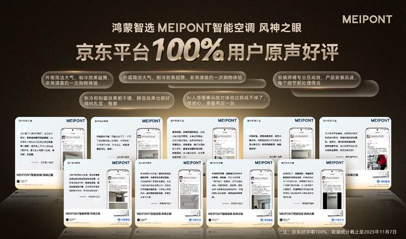 早在今年9月,华为鸿蒙智选首款智能空调“风神之眼”上市即成为市场爆款,其节能、舒适与健康的综合产品力迅速赢得用户认可。在11月7日鸿蒙智选于京东平台发起的首场直播活动中,这一口碑效应得到进一步释放。京东家电家居事业群空调业务部总经理张京在直播中透露,“自9月上市以来,‘风神之眼’好评率持续保持100%,这一表现在行业中极为罕见。”