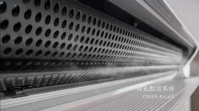 一方面,美的升级了压缩机、风轮和风道,从源头带来强劲风量,并让更多冷量通过微孔扩散,让房间实现快速降温;另一方面,则在主风口处设计了多层次的细密微孔阵列来分流,打散柔化强劲冷风,使风速保持在0.3m/s轻柔的体表风速,再配合高精度湿度传感器和温湿度智控算法,这才解决了冷风直吹带来的不适感,也有效防止了冷风刺激引发的鼻炎、感冒等问题。