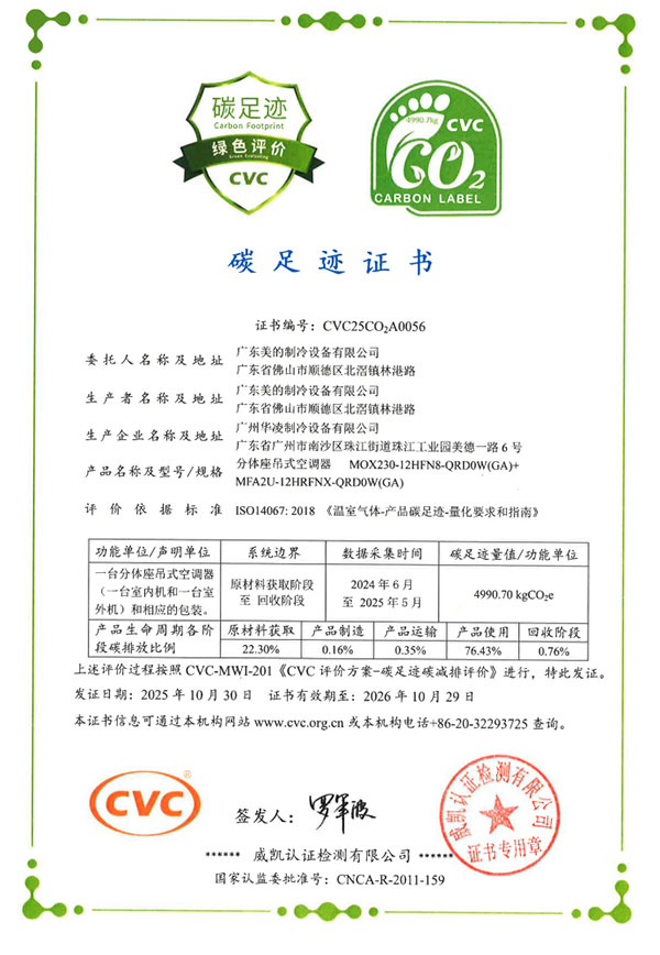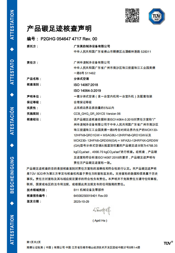近日,在美的集团第30届科技月期间,由美的自主研发的“PCF(Product Carbon Footprint)产品碳足迹管理平台”获得TÜV南德意志集团(以下简称“TÜV南德”)和威凯认证检测有限公司(以下简称“CVC威凯”)两家权威认证机构认可。美的分体式空调等产品顺利通过审核,并获颁发产品碳足迹证书。这标志着美的集团成为业内首家实现“平台开发-评价体系构建-评价认可-核算应用-产品碳足迹认证”全链路闭环的企业。