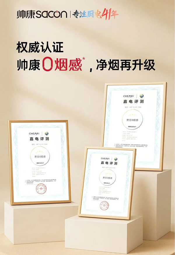 近日,帅康多款吸油烟机,正式通过中国家用电器研究院评测中心的严格测试,荣获“0烟感"权威认证。帅康产品在实际测试中表现优异,显示出其在控制油烟逃逸与提升烹饪体感方面的扎实能力。