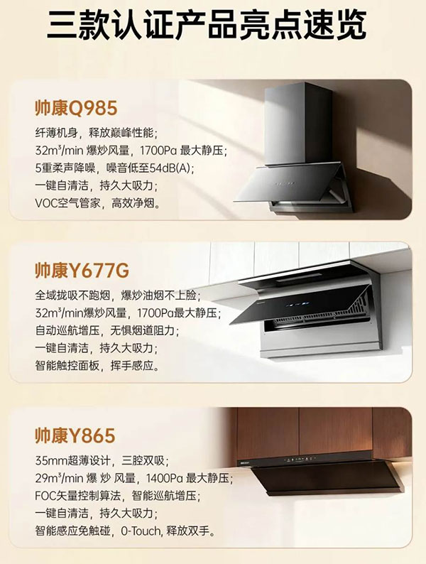 此次多款产品同步获得认证,标志着帅康在吸油烟技术、用户体验与健康标准三大维度上的不断进步。未来,帅康将继续秉持"科技为人,创造健康美好生活"的品牌理念持续推进产品创新与技术升级,为每一个中国家庭打造更健康、更智能、更舒适的厨房生活体验。