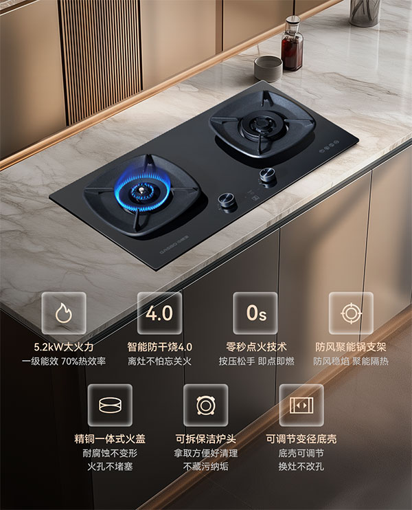 除了安全上的保障拉满,中燃宝Q6521在其它方面的性能也均有所提升。5.2kW 大火力,不管是川湘菜的爆炒,还是粤菜的快炒,都能轻松掌握,锅气十足;精铜一体式火盖,耐腐蚀、不变形,而且火孔不易堵塞,就算长期使用火力依然均匀强劲;一级能效,热效率高达70%,做饭又快又省气。可拆保洁炉头,炉头能直接拆下来,不管是炒菜掉落的残渣,还是煲汤溢出的汤汁,都能轻松清理干净,再也不用担心油污藏在缝隙里,滋生细菌;零秒点火技术,按压松手就能瞬间点燃,点火丝滑不费力。