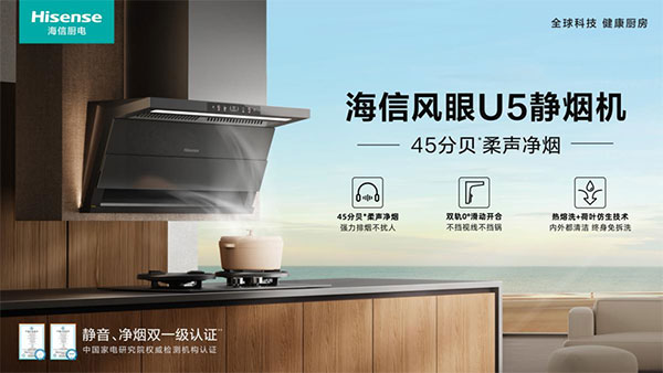 海信风眼U5静烟机,整合欧洲gorenje与北欧ASKO的尖端技术,研发出独家 “风眼引擎”,将运行噪音降至 45 分贝的耳语级水准,斩获中国家电研究院静音、净烟双一级认证。双轨 0° 滑动开合设计让烟机不挡视线不挡锅,热熔洗与荷叶仿生技术更实现 “终身免拆洗”,完美解决了清洁难题。