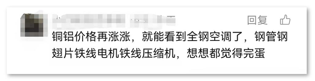 “铜铝价格再涨涨,就能看到全钢空调了,钢管、钢翅片、铁线电机、铁线压缩机,想想都觉得完蛋。”
