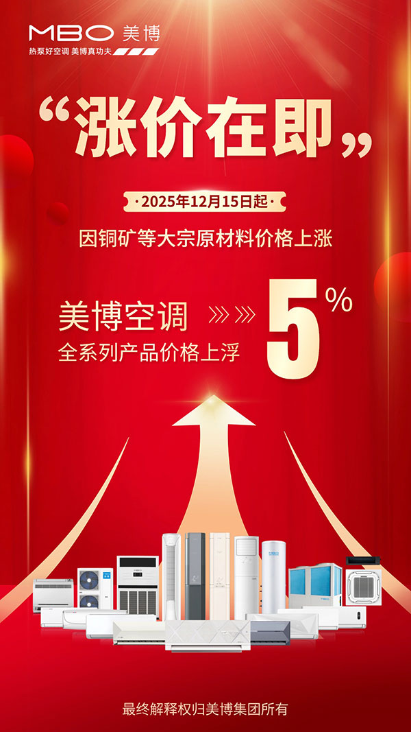 铜价、铝价以及制冷剂等一系列材料成本的迭创新高,与不断下行的整机价格,让空调行业生态的健康有序发展承受着前所未有的挑战。面向2026年的发展,美博空调在12月4日率先发布了涨价通知,该通知显示,美博空调全系列产品价格将于2025年12月15日起正式上调5%。