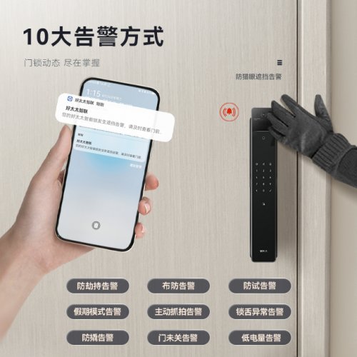 除了强大的生物识别功能,好太太智能锁V81ZMax还配备了十重主动防护机制,为家门安全提供了全方位的保障。防撬报警功能能够在检测到异常撬动时,立即发出高分贝警报声,并第一时间向用户手机发送警报信息,让用户及时掌握家门安全状况;胁迫指纹报警功能则为用户在遭遇危险时提供了一种隐蔽的求救方式,当用户使用预先设置的胁迫指纹开门时,门锁会在正常开门的同时,悄悄向紧急联系人发送求救信息,确保用户的人身安全。