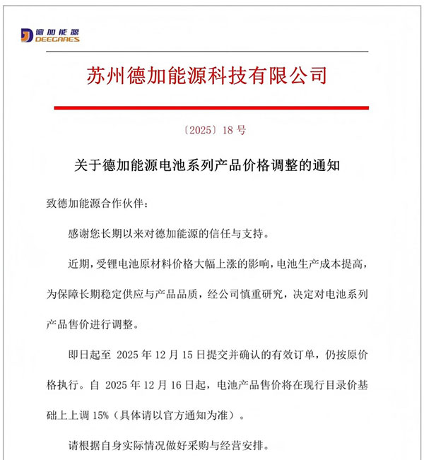 12月9日,德加能源发通知称,受锂电池原材料价格大幅上涨影响,电池生产成本提高,该公司决定自12月16日起对旗下电池系列产品售价上调15%。