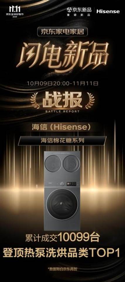 海信洗衣机的竞争力不仅体现在技术层面,更得到了行业与市场的双重认证。2025年前三季度,海信洗衣机国内主营业务收入同比增长30%以上,增速领先行业。海信全家筒上市首月即销量破万,并接连荣获德国IFA“最佳设计奖”、奥维云网“热泵洗烘一体机线下主销价位销量第一”等权威奖项。在此基础上,海信洗衣机继续将热泵洗烘一体机推广普及,其明星产品海信棉花糖E8Q上市首月即登上销量周榜TOP2(来源于奥维云网数据),并荣获了中国家电网颁发的“杰出渠道表现产品奖”。2025年“双十一”期间,更是海信棉花糖系列更是登顶京东平台热泵洗烘品类TOP1(10月9日20:00-11月11日)。