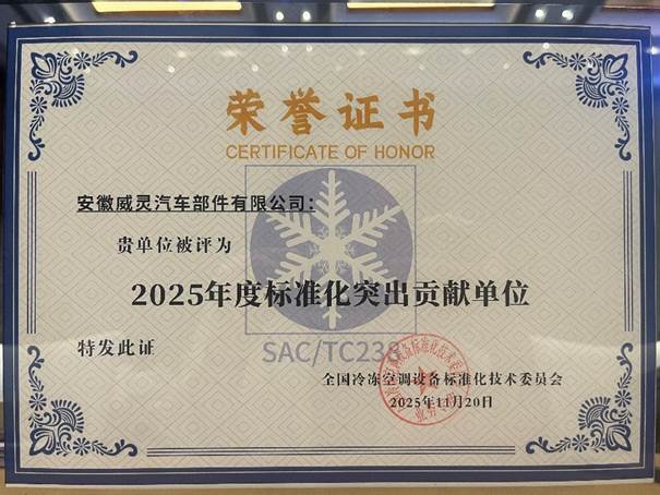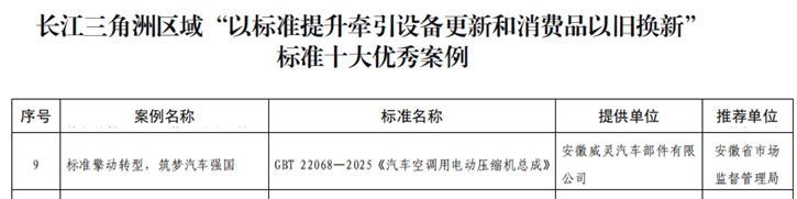 威灵汽车部件主要参与修订的国家标准GB/T 22068-2025 《汽车空调用电动压缩机总成》被长三角三省一市市场监管局联合评为长江三角洲区域“以标准提升牵引设备更新和消费品以旧换新”标准十大优秀案例,被冷标委评为“年度十大新标准”。