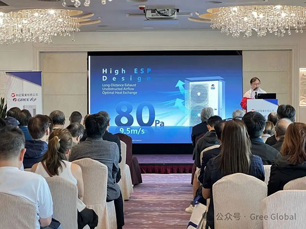 在产品展示环节中,香港商用合作伙伴公司销售工程师蔡勇先生向与会人员详细介绍了格力新推出的R32变频系列U-Match,对产品的尺寸结构和性能进行了详细的阐述,使得与会人员对该系列先进的性能和人性化的产品体验有了更直观的认识,同时对格力水商用产品系列的超高性能和产能实力表示高度认可。