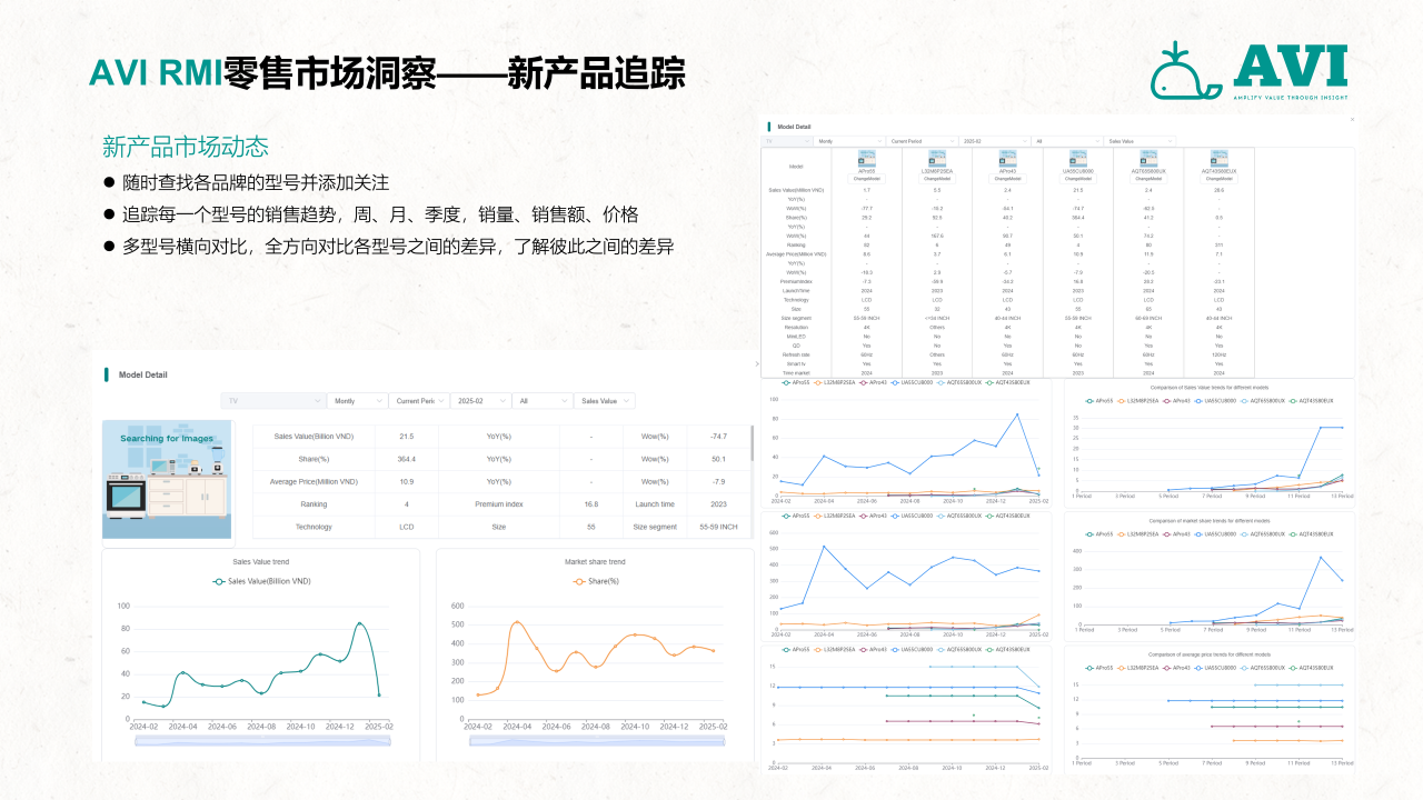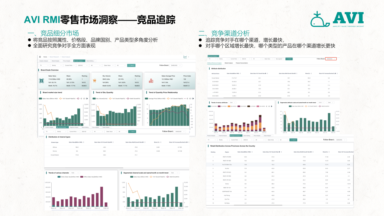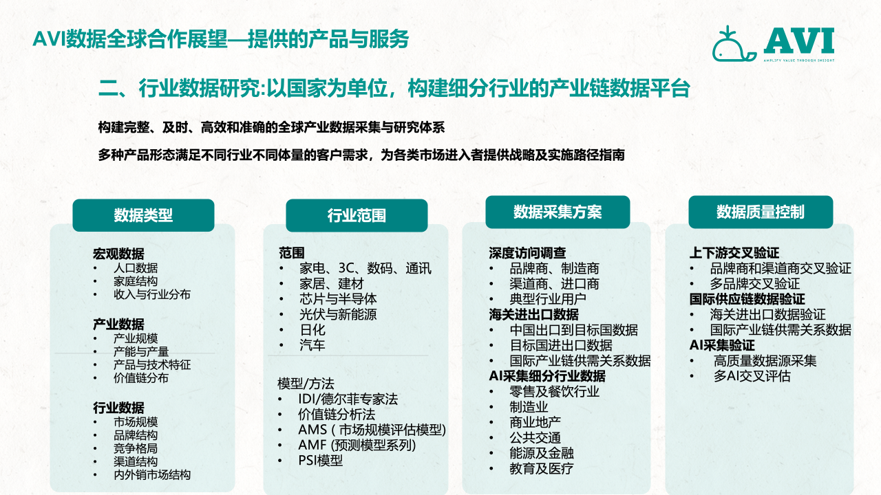 作为中国首家面向全球零售与产业链数据市场的第三方大数据机构,AVI data通过搭建一个覆盖全部线下与线上综合业态的零售数据采集网络,并以国家为单位,构建一套以服务多元化企业的出海需求为目标,涵盖零售、2B工程、上下游产业链投资研发生产、渠道分销、用户需求洞察、售后服务,包括全流程和全价值链的大数据采集和研究服务体系,并通过专业的数据挖掘和分析工具、专业的咨询服务、帮助客户做好更加科学的海外市场开发、渠道管理与投融资管理决策,致力于成为中国企业出海的市场考察“望远镜”、市场投放“指南针”和市场营销“倍增器”,推动行业的创新发展,帮助企业实现内外部跨源数据融合,提升市场洞察力和决策效率。