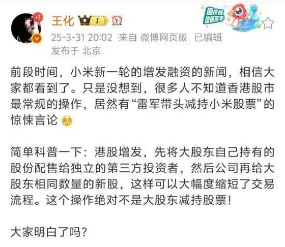 据新浪科技,3月31日晚间消息,小米集团公关部总经理王化在微博发文表示:“前段时间,小米新一轮的增发融资的新闻,相信大家都看到了。只是没想到,很多人不知道香港股市最常规的操作,居然有‘雷军带头减持小米股票’的惊悚言论。”