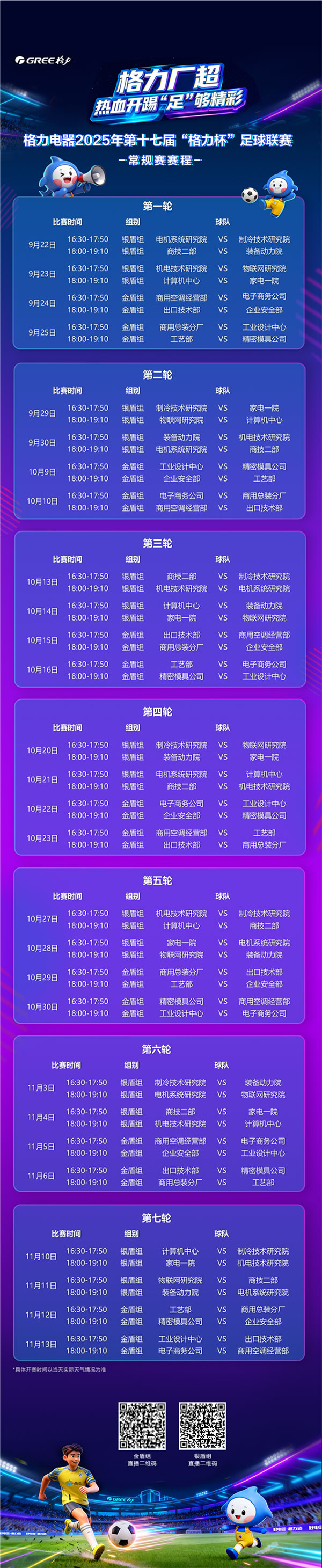 本届联赛由各部门组成队伍参赛,平日里并肩作战的同事将成为绿茵场上切磋较量的对手,为了团队共同荣誉而全力以赴。这不仅是一场体育竞赛,更是格力人拼搏精神与团队文化的集中体现,无论你是球场上的“核心发动机”,还是观赛区的“最强呐喊者”,这里都因你而精彩!热烈欢迎每一位格力人的到来,共同见证激情与活力的绽放!