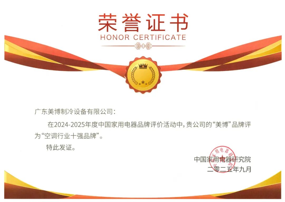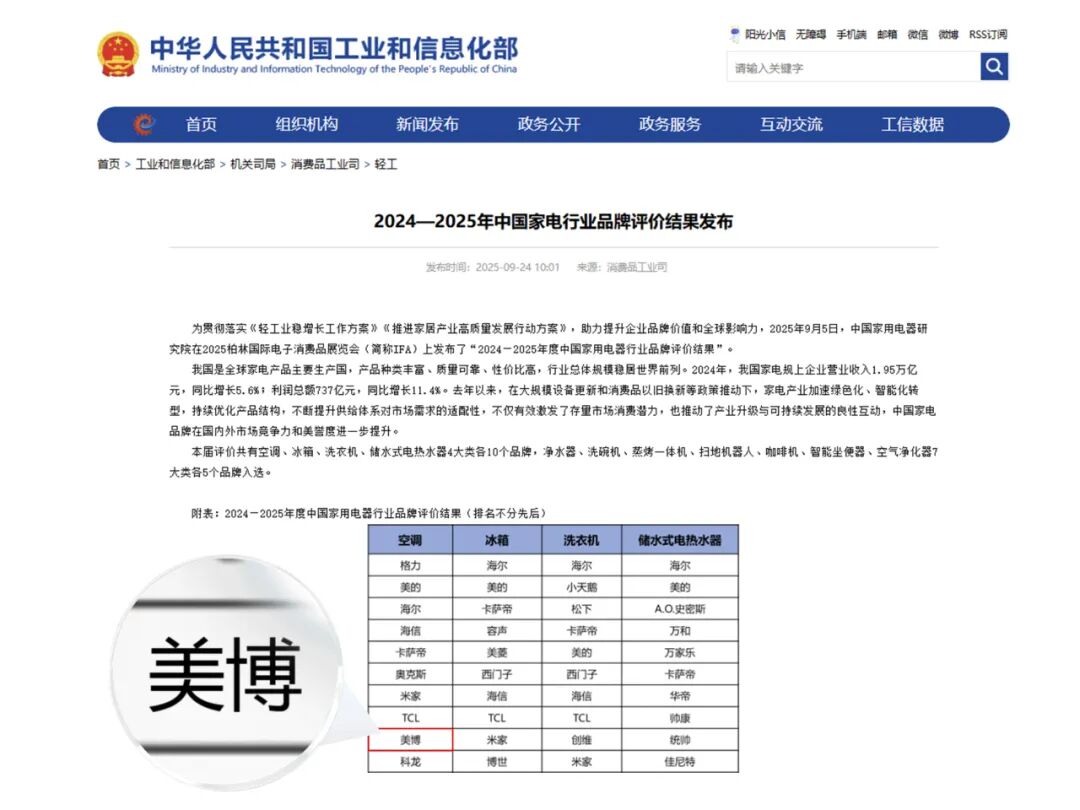9月24日,中华人民共和国工业和信息化部网站发布了由中国家用电器研究院评选的《2024—2025年中国家电行业品牌评价结果》发布。美博凭借在品质力、创新力与品牌力上的持续表现,再次入选“空调行业十强品牌”,并实现了连续四年获此殊荣。这一成就,不仅彰显了行业与市场对美博的高度认可,更为企业迈向全球化发展注入了新动能。