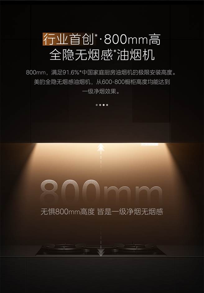 美的全隐无烟感油烟机T9,是行业首创800mm高能实现一级净烟的全隐油烟机。这一高度,可完全满足91.6%中国家庭厨房油烟机极限安装高度,并且实现开关机状态下的全时全隐。该创新设计,不仅解决了普通油烟机下厨不便、占据厨房空间的困扰,而且轻松融入各式厨房风格,让油烟机成为家居的一部分。这款油烟机也是行业首款全时全隐形态设计的油烟机,打破传统油烟机形态边界,重新定义厨居新美学。