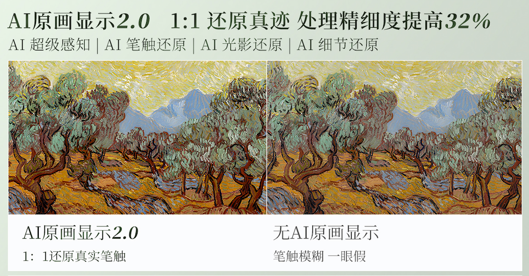 对于壁纸电视来说,能否呈现真实“画感”至关重要。创维A7H Pro升级搭载了“AI原画显示2.0”技术,当识别到画作时,不仅会根据内容智能优化肌理,还能通过感知环境光线的细微变化,进一步调整观感,从笔触、光影、细节三个维度同步增强显示。相较于上一代技术,“AI原画显示2.0”的处理精度提升了32%,1:1还原画作真迹。