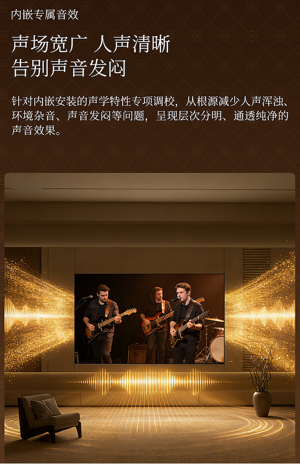 值得一提的是,创维A7H Pro还针对内嵌式安装做了专项调教,从根源上规避了因嵌入墙体安装所产生的声音发闷、人声浑浊等问题,结合左右回音壁设计,大幅提升了声音解析力与环绕感。不管是挂墙、内嵌还是落地支架的安装方式,都能确保听感的清晰和统一。