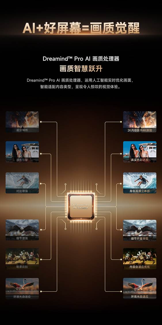 电影、动画、体育和游戏等不同类型的内容,在亮度、色彩和清晰度方面的需求存在较大差异。而传统电视往往仅能提供固定的画质模式,或者需要用户手动进行模式调节,且参数固定,无法提供最优解决方案。Dreamind Pro AI 处理器借助硬件级 AI 运算,能够识别内容类型并自适应地优化画质:在电影场景中,暗部细节更为丰富;在运动画面里,动态清晰度更高;在动画与游戏中,色彩更加生动饱满,为不同内容提供量身定制的最佳视觉体验。不少用户为获得理想的观看效果,需要手动切换画质模式或调整亮度和色彩,操作繁琐且耗时。Dreamind Pro AI 处理器可自动完成画质优化,无需用户干预,确保每一帧画面始终呈现最佳视觉效果。同时,该处理器结合环境光调节和动态亮度调节,实现适合长时间观看的舒适亮度,减轻视觉疲劳。