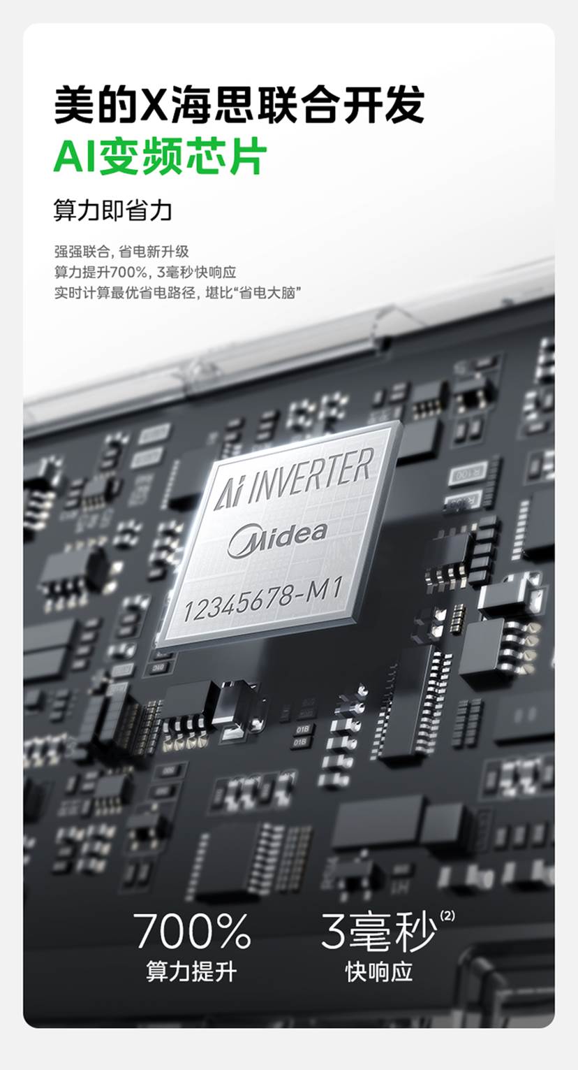 纵观家电省电技术已历经三代迭代,各阶段技术路径清晰可见。1.0 阶段以格力为代表,核心是优化硬件参数,靠预设机械程序控制能耗,虽能降低基础能耗,却无法根据实际使用场景动态适配;进入 2.0 阶段,海尔、小米等品牌转向自研算法升级省电路径,但采用云端决策模式,设备能耗调整需依赖。而美的则率先布局3.0阶段的边端芯片技术研发,与海思联合打造行业首款AI变频芯片,该芯片算力较普通芯片提升700%,能快速感知环境与习惯,并以低于3毫秒的速度实时计算最优省电路径,精准避免无效能耗。正式推动空调行业迈入“省电芯时代”。