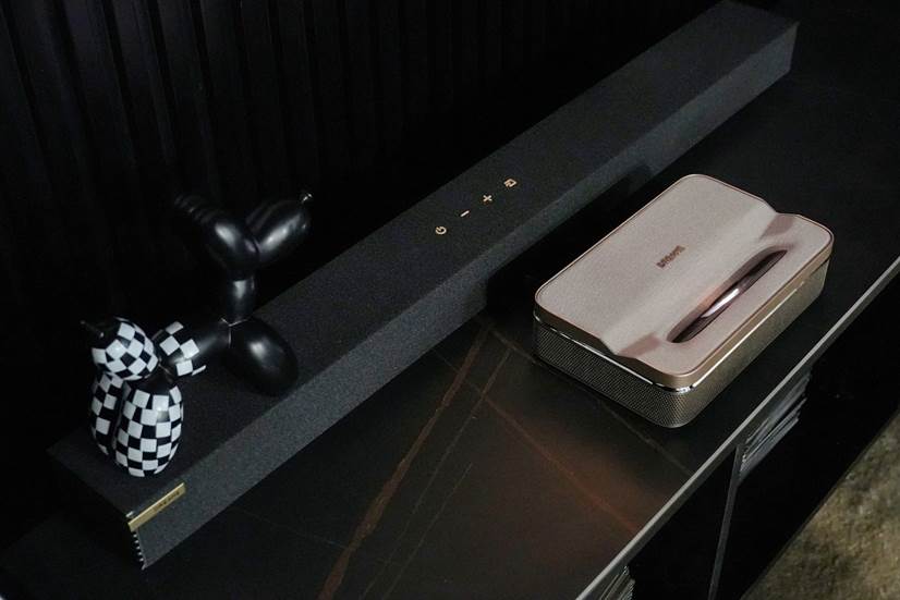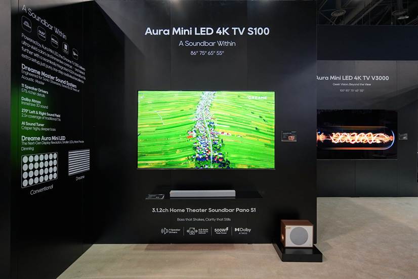 较早于海外上市的Aura Mini LED电视S100此次在北美首秀,同样备受关注。它带来了具有颠覆性的“SoundBar within”设计,将一套完整的4.1.2声道大师声学系统与Aura Mini LED卓越画质相融合。11个发声单元提供峰值70W功率和270°物理声场覆盖,使其无需外接任何音响,便能在客厅中营造出身临其境的环绕立体声效果。144Hz超高刷新率与全阵列局部调光技术,确保了观影与游戏时的丝滑流畅以及深邃画质。无论是欣赏电影大片还是进行主机游戏,S100都能提供极致的沉浸式体验。