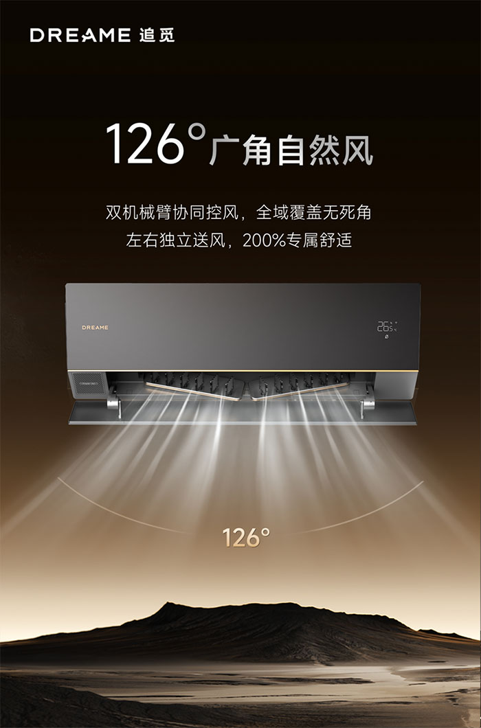 作为核心技术引擎,追觅空调“双机械臂驭风系统”,获得多项发明专利认证授权。该系统通过两组机械臂结构,协同驱动左右导风机构,实现126°广角送风与±0.5°C全屋匀温。结合AI人感追踪算法,可实时进行毫米级风向微调,精准实现“风随人动,风避人吹”,标志着空调从被动调节迈入主动式舒适送风的新阶段。
