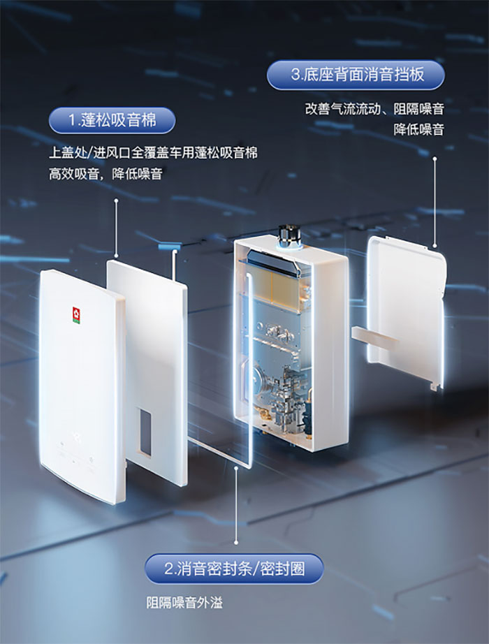 机身的上盖处和进风口全覆盖车用蓬松吸音棉,可有效吸收运行时产生的高频噪音;消音密封条、密封圈与底座背面的消音挡板形成多重防护,既能优化气流流动效率,又能牢牢阻隔噪音外溢,让热水器运行时的噪音降至极低水平。从此,用户无需再掐着时间卡点洗澡,沐浴时间更自由,随时随地都能沉浸在安静舒适的热水体验中,享受安静无扰的用水体验。
