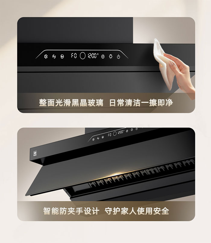 樱花吸油烟机K602采用纤薄的机身设计,外观线条简洁利落,和各种厨房风格都能自然融合。易洁黑晶玻璃质感的面板,让油污不容易附着,烹饪结束后一擦即净,轻松保持机身的净爽。搭配电动翻板的智能开合设计,过程流畅自然,同时具备防夹手安全保护机制,无论是忙中操作,还是老人、孩子在旁,都能以周到的安全设计减少意外发生,既好用,也更值得信赖。