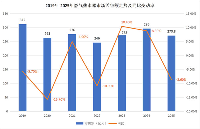 2023至2025年,热水器市场经历了一段从复苏到回调的起伏过程。2023 年行业迎来复苏,电热水器、燃气热水器零售额同比分别增长 4.0%、10.4%;2024年,在政策推动的以旧换新活动带动下,两大品类延续增长态势,零售额同比分别上涨1.3%、8.8%。然而进入2025年,受宏观经济环境与房地产市场调整的双重影响,行业再次承压,市场整体规模出现回调。
