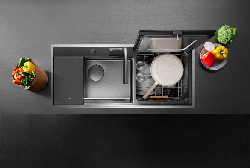 而且,这款洗碗机合理地利用水槽区域空间,不需要再占用厨房中其他空间,以平嵌安装方式完美融入整个厨房的操作台区域,不仅视觉上更加简洁美观,更可以让整个厨房洗菜备菜的操作动线变得更合理:在水槽区域,你可以完成洗菜、切菜、配菜、沥干的全流程,不用再像传统厨房一样腾挪操作,洗切配沥不折腾,无形中也更加省时省力。