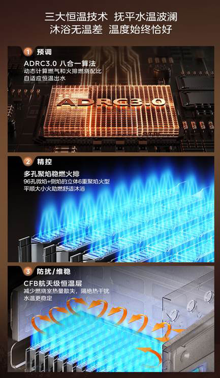 在基础效能之外,洗浴体感的稳定性依然是评价产品价值的硬指标。通过CFB恒温层与 ADRC 3.0智能算法的结合,系统可以实时监测水压和流量变化,将水温波动控制在0.1度以内,并获得了行业7A恒温认证。这意味着在多点用水等复杂场景下,用户仍能获得稳定的洗浴体验。