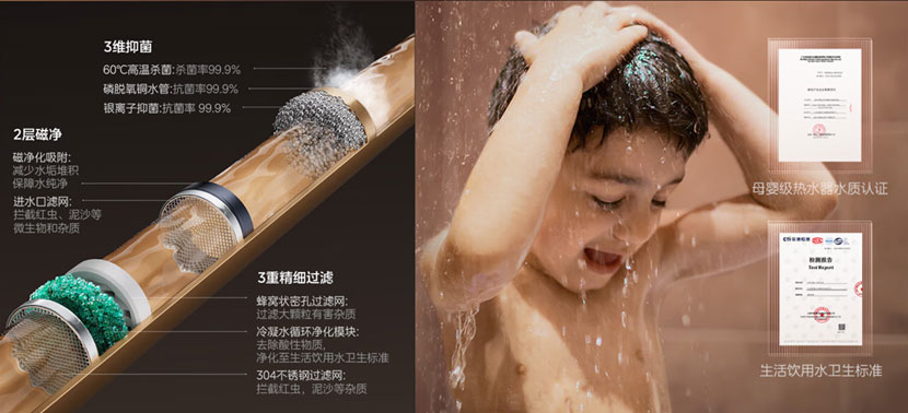 解决冷凝水排放痛点,是推动普及的关键突破。美的行业首创冷凝水净化技术,搭载母婴级净滤系统,净化后的沐浴水质获“国标生活饮用水卫生标准”认证和“母婴级热水器认证”,解决了冷凝水排放行业难题,彻底告别了排水管,做到节能省钱,安装更美观。