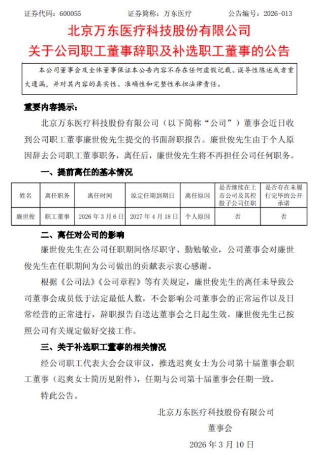 3月10日,万东医疗发布公告,公司董事会近日收到公司职工董事廉世俊提交的书面辞职报告——由于个人原因,廉世俊辞去公司职工董事职务,离任后,将不再担任公司任何职务。与此同时,经公司职工代表大会会议审议,推选迟爽为公司第十届董事会职工董事,任期与公司第十届董事会任期一致。