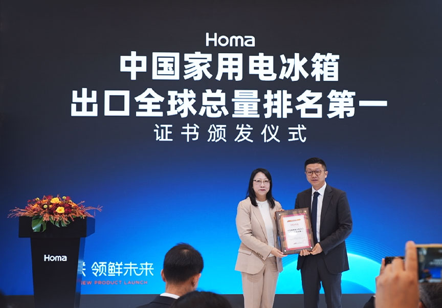 本次发布会上,欧睿国际中国区总经理穆愔女士为奥马冰箱颁发了2025年在中国家用电冰箱出口全球总量第一、出口欧洲总量第一的证书。