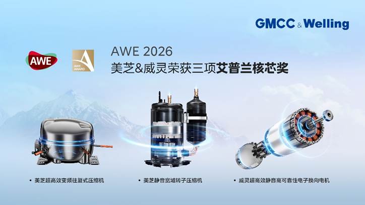 【中国·上海 】2026年3月12日,全球领先的暖通家电核心部件供应商GMCC 美芝、Welling 威灵亮相 2026 中国家电及消费电子博览会(AWE 2026)(展位号:E2号馆 2F31),现场展示了涵盖空调、冷冻冷藏、洗护等电器领域的核心部件产品,包括家用、商用、移动、房车空调及热泵采暖用的转子式压缩机、涡旋式压缩机、阀、芯片等,家用、车载冰箱及轻商领域的往复式压缩机,以及包括洗衣机、洗碗机、热泵干衣机、热泵热水器领域的电机、循环泵等产品,以核心科技、硬核产品以及全场景系统级解决方案为消费者构建高品质舒适生活、为暖通家电产业高质量发展注入活力。