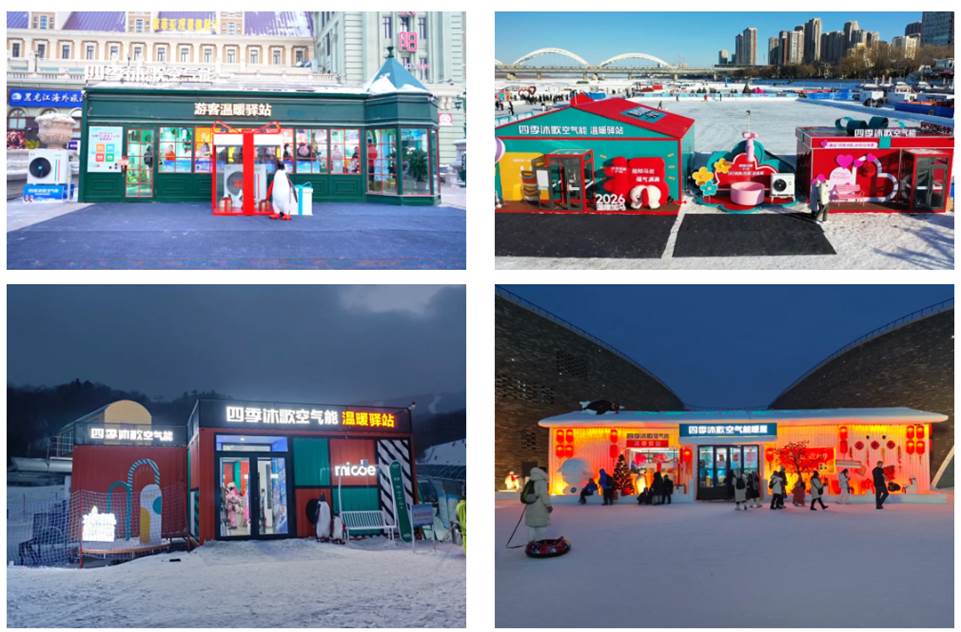 自2021年以来,四季沐歌连续三年在哈尔滨冰雪大世界、索菲亚游客广场、松花江冰雪嘉年华、亚布力滑雪场等核心文旅场景,搭建空气能游客温暖驿站。在零下二三十摄氏度的极寒环境下,依托南极同款超低温热泵技术稳定输出温暖,为游客提供休憩取暖、热水补给等公益服务,同时打造沉浸式技术体验场景,让极地科技从幕后走向台前,直观破解消费者对空气能极寒运行稳定性的认知痛点。