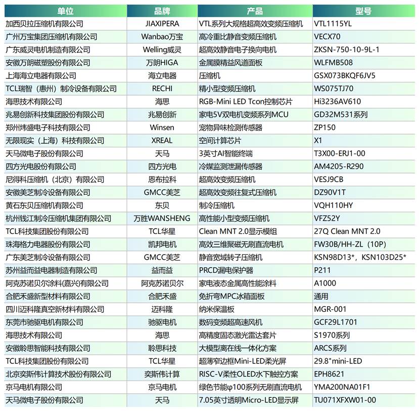 培育和发展新质生产力,离不开产业链上游优秀解决方案的强力支撑。本次产业链大会上,2026年AWE艾普兰核芯奖正式揭晓(见下表)。这些获奖产品,锚定绿色、智能、健康的主要发展方向,为家电产业高质量发展带来丰富的硬核创新技术支撑。