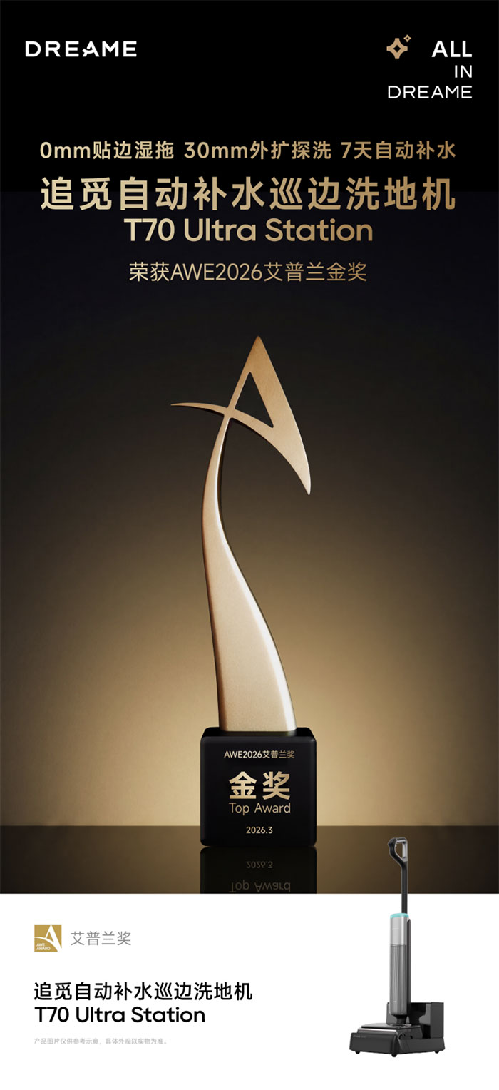 在AWE2026的聚光灯下,追觅T70 Ultra Station捧起了代表家电界最高荣誉的“艾普兰金奖”。但在许文静看来,真正的金奖不在展柜里,而在万千用户能够解脱繁琐劳作,享受闲暇的舒适生活里,“这是对研发团队最直接、也是最高的褒奖”。