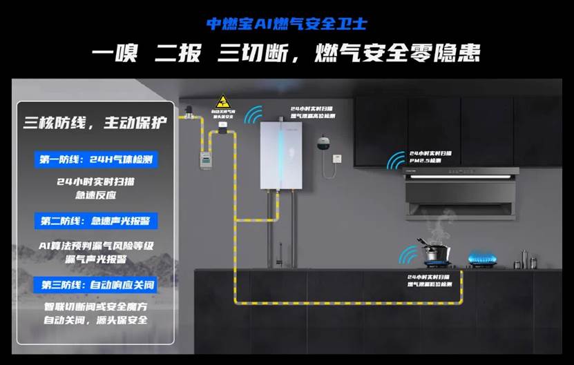 安全创新,是中燃宝持续领跑行业的核心竞争力。针对家庭厨房安全痛点,中燃宝深耕技术研发,推出一系列硬核安全技术。燃气灶搭载防燃气泄漏报警专利技术、智慧防干烧4.0技术,以及防爆裂、防生锈、防漏气、防爆燃、防回火的安全5防科技,有效规避漏气、干烧、爆裂等安全隐患;燃气热水器配备防燃气泄漏报警专利技术与max全域零冷感系统,以及安全6防科技,兼顾安全与舒适;壁挂炉则搭载全预混冷凝技术与七重安全防护,在节能高效的同时,全方位守护家庭采暖安全。而且中燃宝安全家、生活家套系产品搭载AI燃气安全卫士防护系统,实现“监测—报警—关阀—排气”全流程自主防护,构建起24小时主动防御网络。