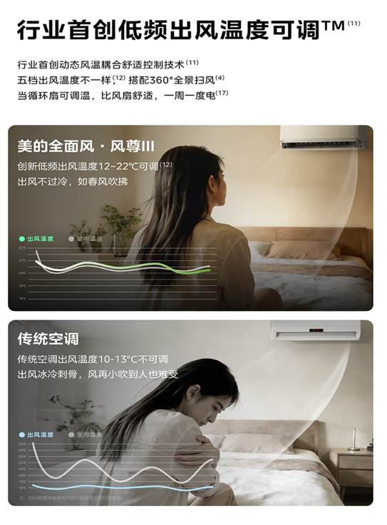 美的全面风·风尊三代的亮相,正是对这一痛点的彻底回应。它以360°全景控风科技与低频分级调温技术为核心,打造行业首款真正意义上的“四季空调”,让空调从“季节性两季产品”升级为“全年舒适刚需品”。