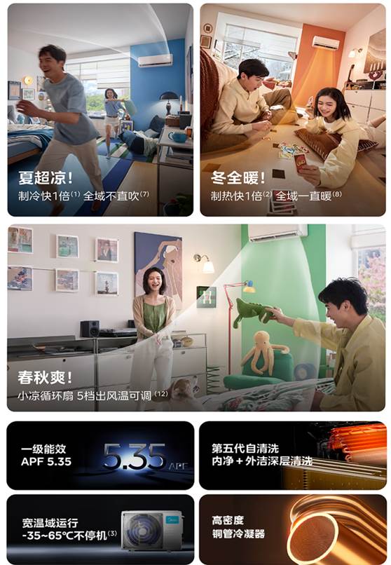 作为家电行业领军品牌,美的空调深耕空气调节领域多年。此次推出的全面风·风尊三代,并非简单的产品迭代,而是对空调使用场景的颠覆性重构——打破“冬夏用、春秋闲”的季节局限,让空调从两季产品升级为365天全天候的家庭空气管理中心。