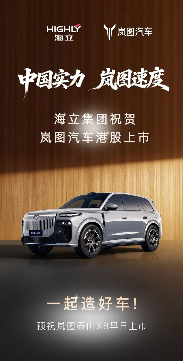 2026年3月19日,岚图汽车正式登陆港股市场,开启企业发展全新篇章。海立集团作为岚图汽车核心配套合作伙伴,旗下海立马瑞利、海立新能源两大板块深度参与岚图多款车型研发与量产,以核心热管理技术为岚图发展注入强劲动力。值此重要时刻,海立集团谨致以热烈祝贺,愿与岚图汽车持续深化战略合作,以技术创新共筑新能源汽车产业发展新高度,彰显中国实力,共创岚图速度!